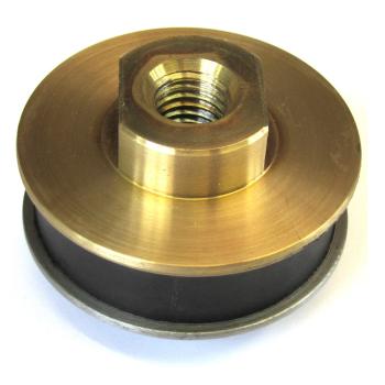 Elastische Kupplung aus einer Gummi-Metallverbindung. Das Oberteil besteht aus Messing mit Innengewinde, das Unterteil aus Stahl mit Gewindezapfen.