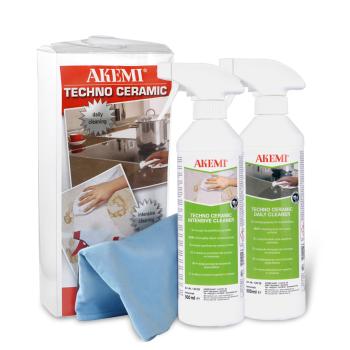 in transparenter, quadratischer Kunststoffbox. Inhalt: 500 ml Techno Ceramic Intensive Cleaner, 500 ml Techno Ceramic Daily Cleaner, 1 Microfasertuch